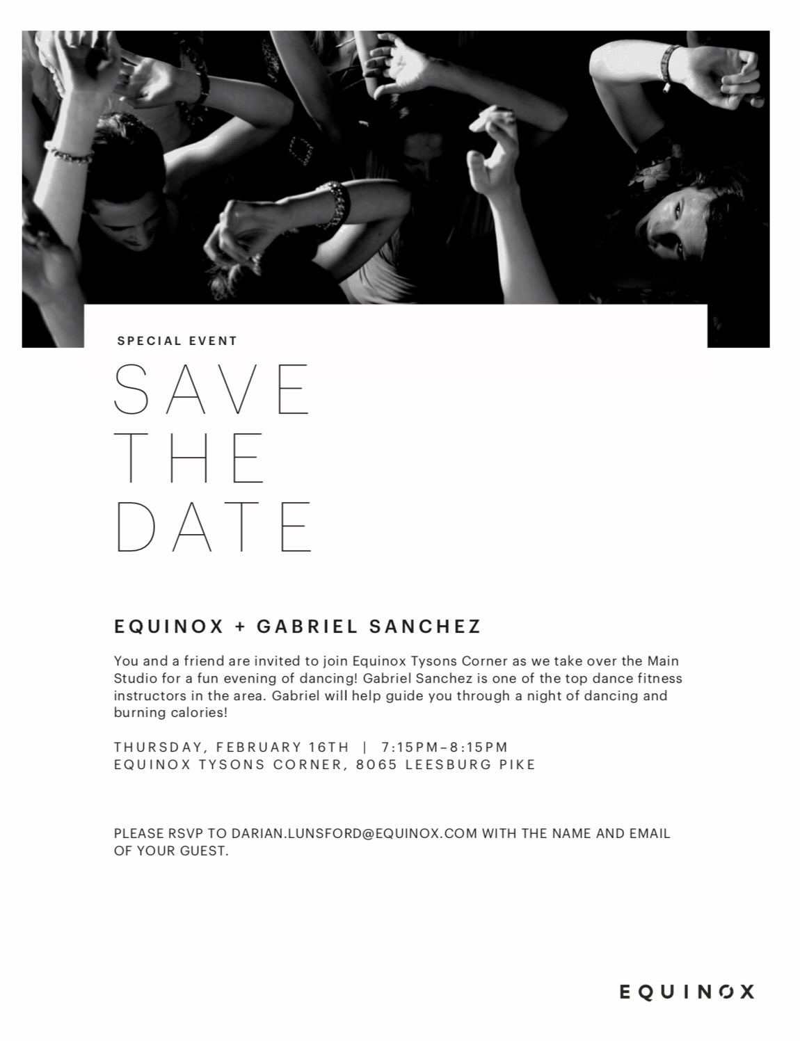 Every Equinox member can bring a guest just send an email to the email at the bottom of this image! February 16, 2017 at 7:15pm, Equinox Tysons Corner!!